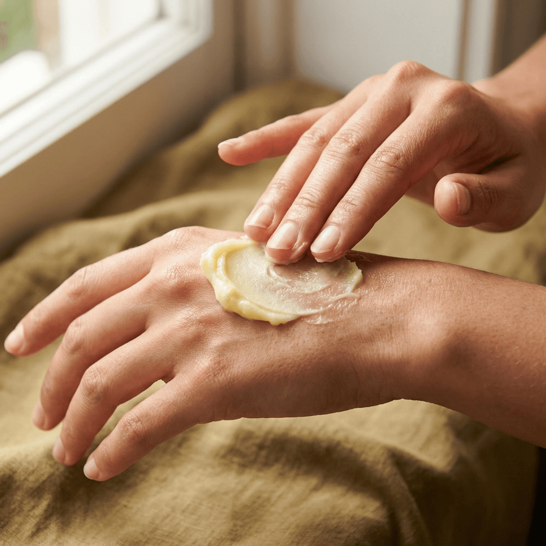 Its creamy texture warms on contact, making it easy to spread and deeply comforting to apply.
